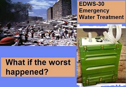 Another example: Occasionally, local drinking water distribution systems, such as schools, hospitals, and office buildings, become biologically contaminated. Typically this requires an extensive and time-consuming decontamination of all of the piping leading off the water main and throughout the building. In the meantime, people must rely on bottled water, which is expensive. The Innosol-EDWS technology can render this event much less disruptive. Using the Innosol analytical instrumentation Innosol-WDS, the precise location of the contamination can be determined, and then the only this specific location can be decontaminated reducing the cost of both time and money to bring the drinking water distribution system online. At the same time, the Innosol-EDWS emergency water unit can supply dwellers with drinking water while assuring 100% neutralizaiton of the said contaminaiton.
