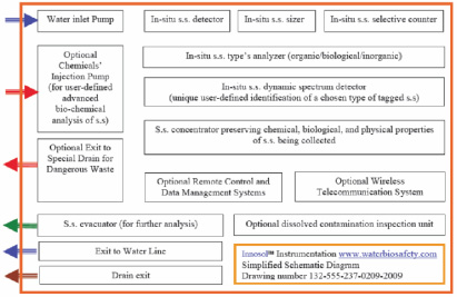 Furthermore, concentration of SS from thousands of litres (or gallons) to a 1-L bottle (1/4 gal) for further analysis by accredited labs, where desired, is achieved by replacing traditional filter-based methods of collecting suspended solids with the fundamentally new proprietary Innosol technology in order to preserve the physical, chemical, and biological properties of the SS. This is accomplished by using electrostatic and magnetic fields as well as other physical principles to trap SS. A dynamic spectrum analyzer in combination with an injection port for labeling compounds, where required, allows the Innosol to carry out highly customized advanced analysis of SS samples as well.